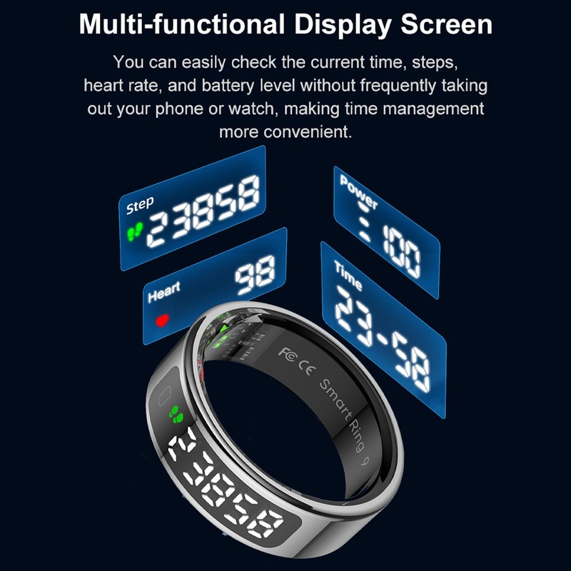 - Multi-functional Display:This smart ring features a high-definition multi-functional display, showing time, steps, battery life, and more in real-time. Easy to operate, it keeps you informed and in control of your daily rhythm.