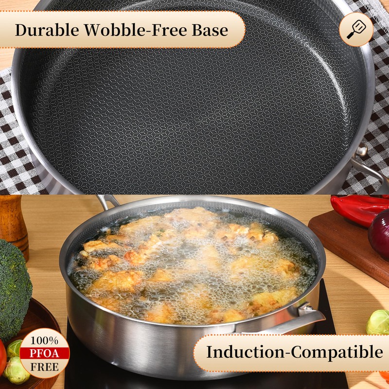 LOLYKITCH 7 Quarts Hybrid Non Stick Tri-Ply Stainless Steel Sauté Pan with Lid,12 Inch Deep Frying Pan,Large Skillet,Induction Cooking Pan, Oven Safe and Detachable Handle.