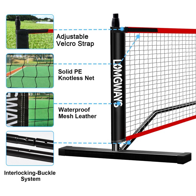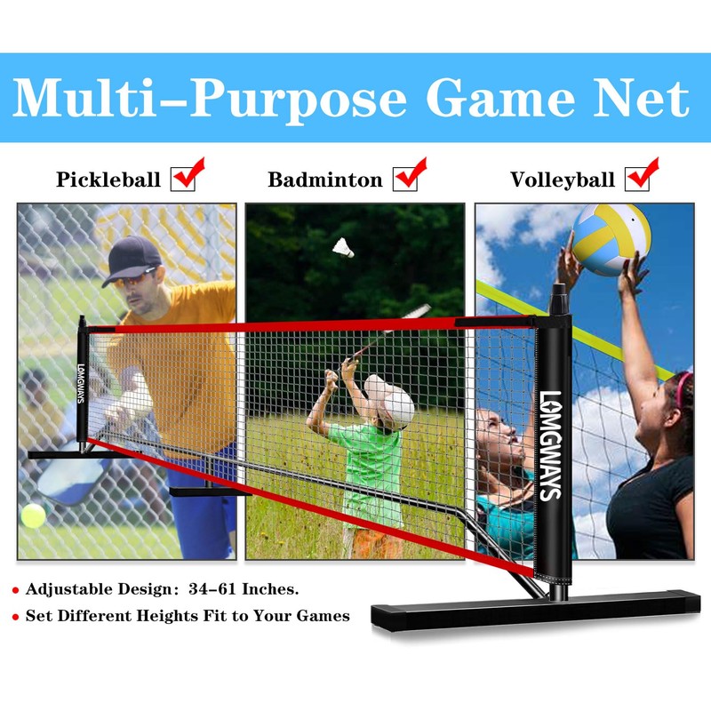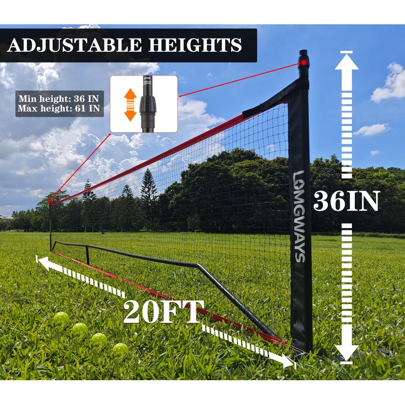 - -【MULTI PICKLEBALL NET】This multi-purpose pickleball net has a width of 20FT and a height range of 34-61 inches.Adjustable design to meet your different needs.Ideal as a tennis net, badminton net or children's volleyball net for the yard, beach, driveway, or any flat area.The net can be used as a tennis net, badminton net or children's volleyball net. Have fun anytime, anywhere!