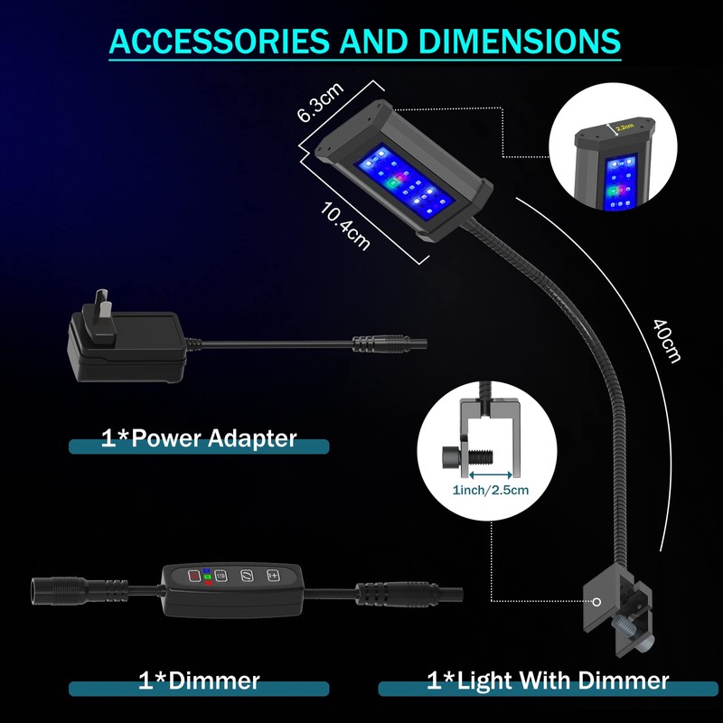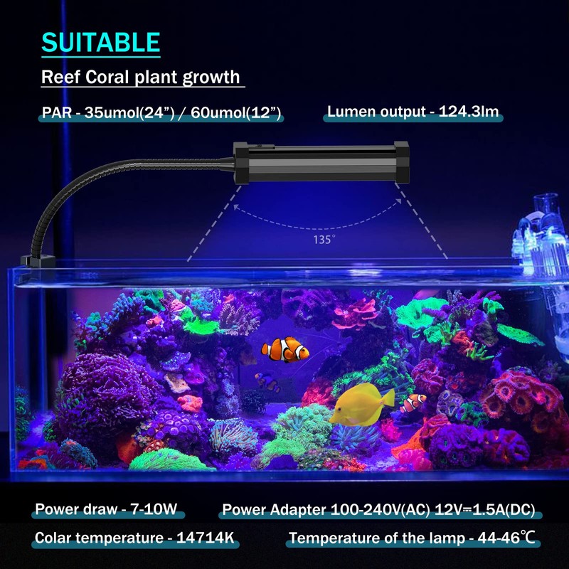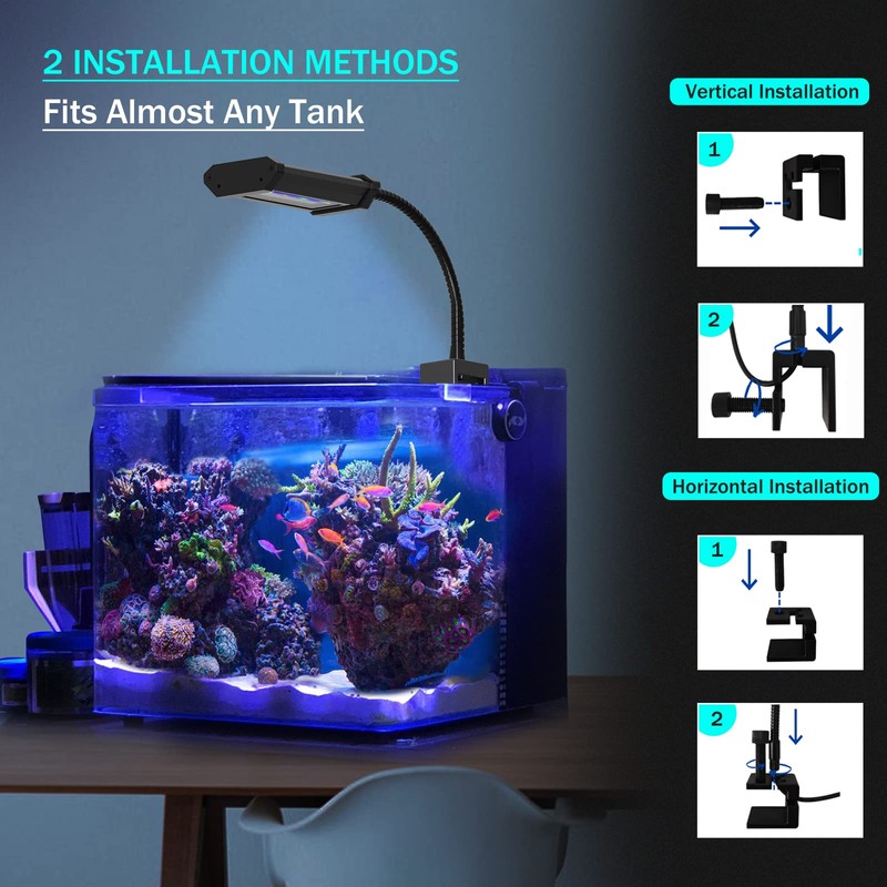 - Easy to Install: Fish Tank Clip on Light with a 0.98 inch wide clip. Fits most aquarium walls, plastic screws will not scratch tank glass. Please mount the light carefully on your tank. Different light angles can make your aquarium tank show different feelings. The soft gooseneck can be adjusted in 360 degree angles and positions, and adjust your lighting angle as you like.
