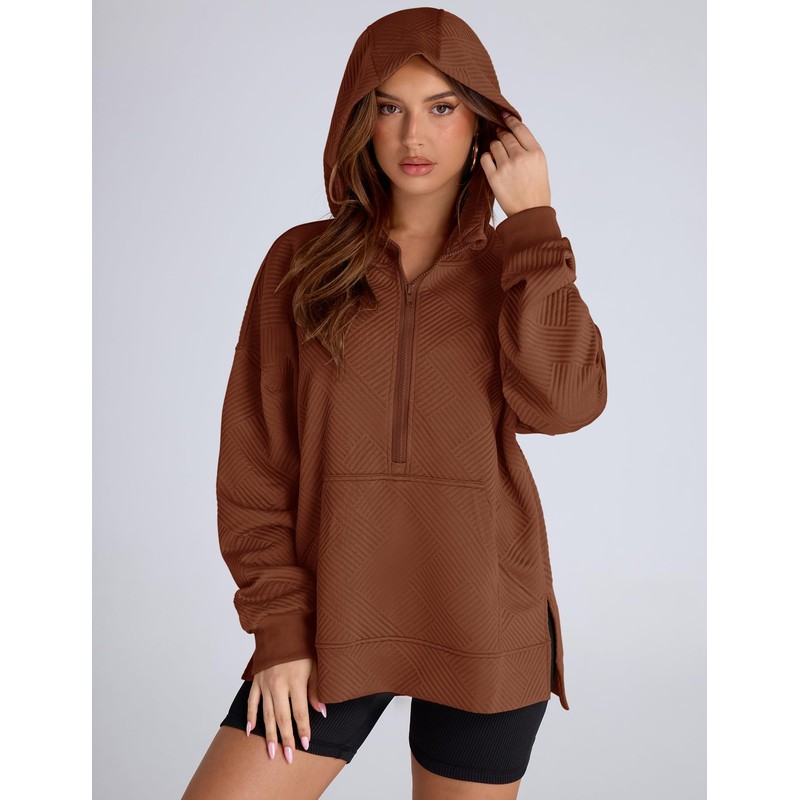 LOMON Women's Oversized Sweatshirts Textured Half Zip Hoodies Tops Side Slits Long Sleeve Pullover Shirts