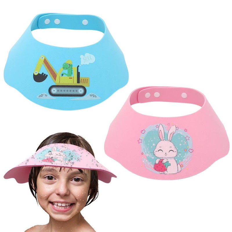LOMUG Baby Shower Cap with Adjustable Velcro Fastening - Soft EVA Material Protects Eyes, Nose & Ears from Water & Shampoo (Blue Dinosaur + Pink Rabbit)