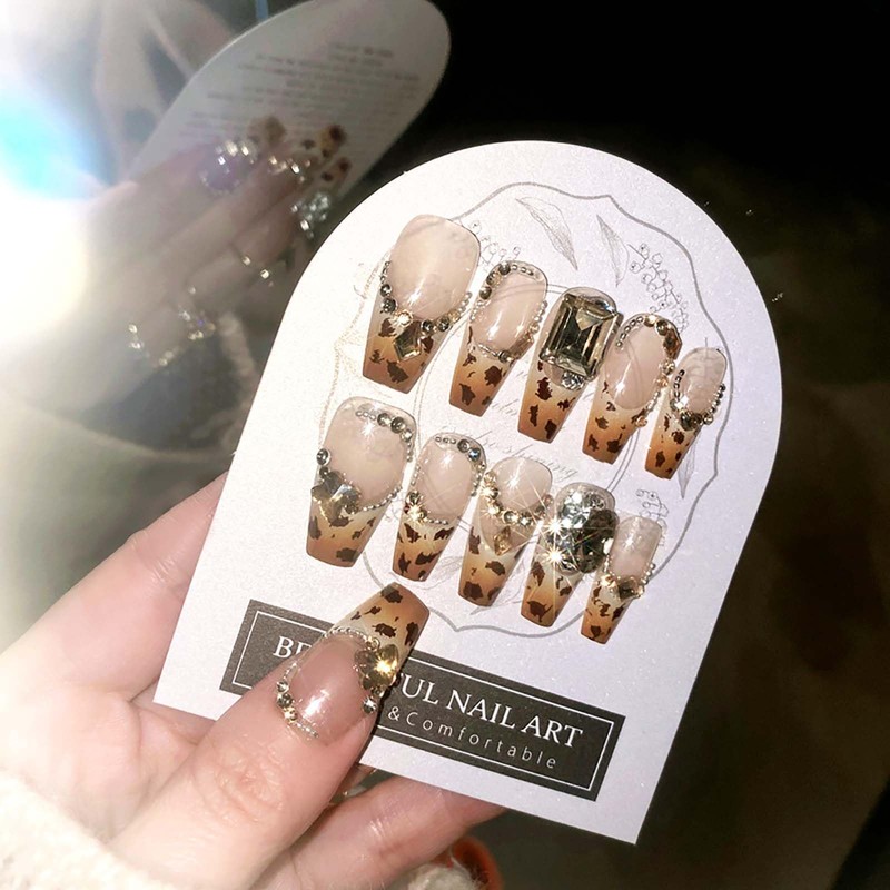 Lomxene Press On Nails Coffin Fake Nails Nails Leopard Print Press Ons Medium Acrylic Nails Glossy Glue On Nails Artificial Nails False Nails Stick On Nails 24pcs(Coffin Medium French Rhinestones)