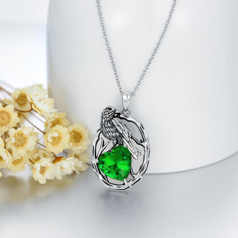 LONAGO Crow Necklace 925 Sterling Silver Raven with Heart Shaped Birthstone Pendant Necklace for Women, Sterling Silver, Cubic Zirconia