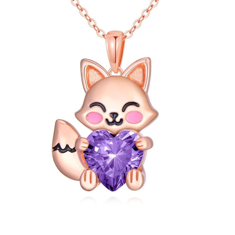 LONAGO Fox Necklace 925 Sterling Silver Cute Fox Holding Heart Shaped Birthstone Pendant Necklace for Women, Sterling Silver, Cubic Zirconia