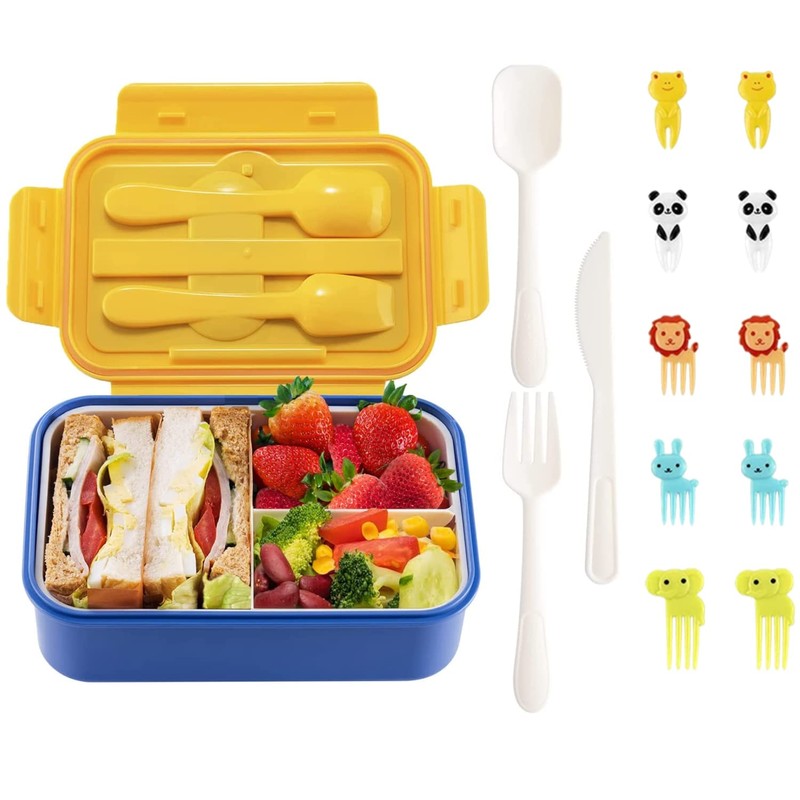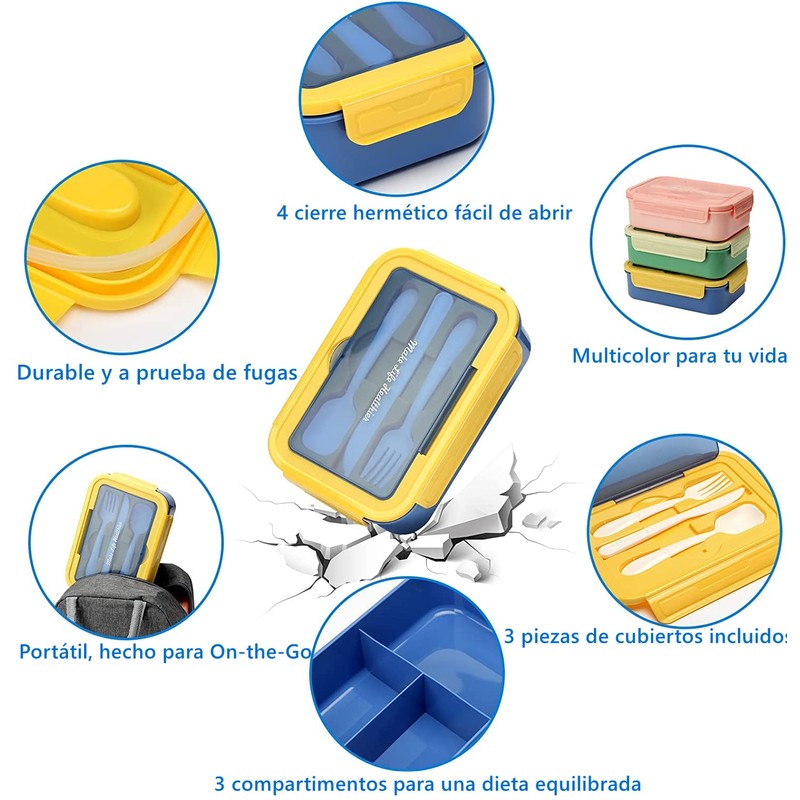 - 【3 COMPARTIMENTOS Y CON UTENSILIOS】- Los 3 compartimentos pueden separar diferentes alimentos para mantener el sabor original de la comida, en porciones perfectas para el apetito de niños y adultos. El cuchillo, el tenedor y la cuchara están integrados en la tapa.