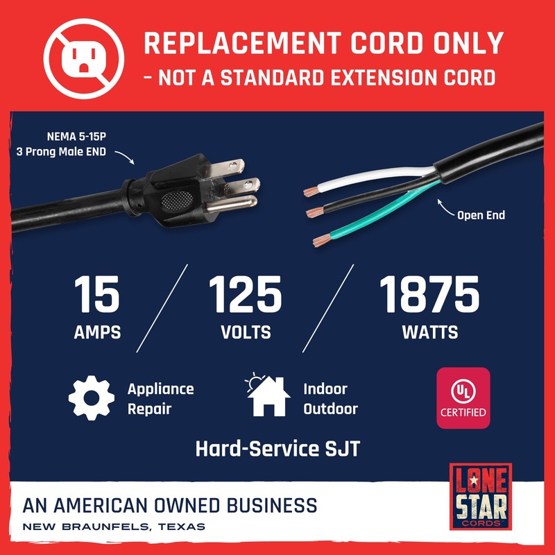 The Lone Star 12 AWG Replacement Cord with Open End is the ultimate heavy duty power cord designed to provide reliable power for a variety of appliances, tools, and DIY projects. Whether you need a replacement power supply cord for your power tools, washer, or electrical door, this AC power cord 3 prong delivers unmatched durability and performance. Crafted with pure copper wire and high-quality vinyl insulation, this AC cable ensures optimal conductivity and long-lasting use. Featuring reinforced blades to prevent bending or breaking, this AC cord is built for demanding environments. UL certified for safety, it supports 15 Amp, 125 Volt, and 1875 Watt power loads, making it a dependable choice for both home and commercial applications. The 15 Ft length offers flexibility, while the open-end 3-wire pigtail electrical design allows easy customization for repairs and projects requiring pig tails electrical connections. As a Texas-based, veteran-owned business, Lone Star Cords stands behind its commitment to providing high-quality, dependable products. Whether you're replacing an old cord or creating a custom setup, trust this heavy duty power cord to deliver the performance and durability you need.