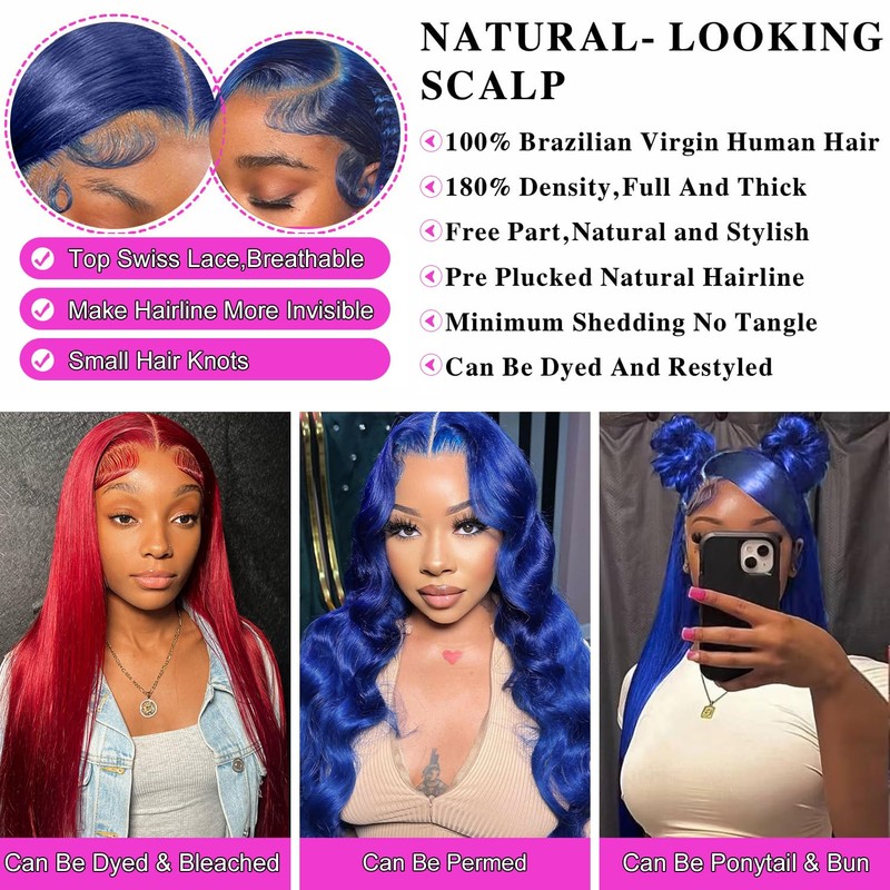 - Royal Blue Lace Front Wigs Human Hair Feature: 13x4 glueless straight hd transparent lace front wigs pre plucked with baby hair 180% density soft, minimum shedding, tangle free, can be premed, curled and restyled, can be side part, middle part, high ponytail & bun, styled as you like.