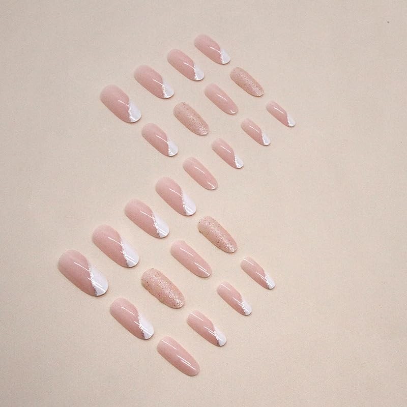 Long Almond False Press On Nails 24PCS, White Slanting French Tip Nails with Nail File, Prep Pad, Design Glue On Nails Package for Home Manicure for Lady