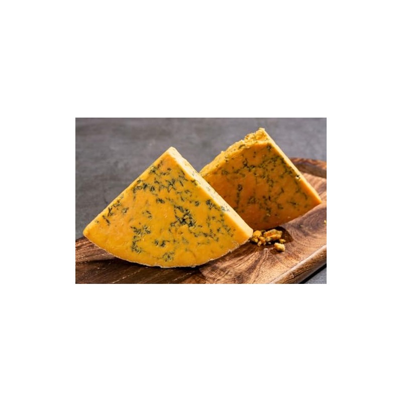- Rich orange in color with distinctive blue veining and a golden crust.