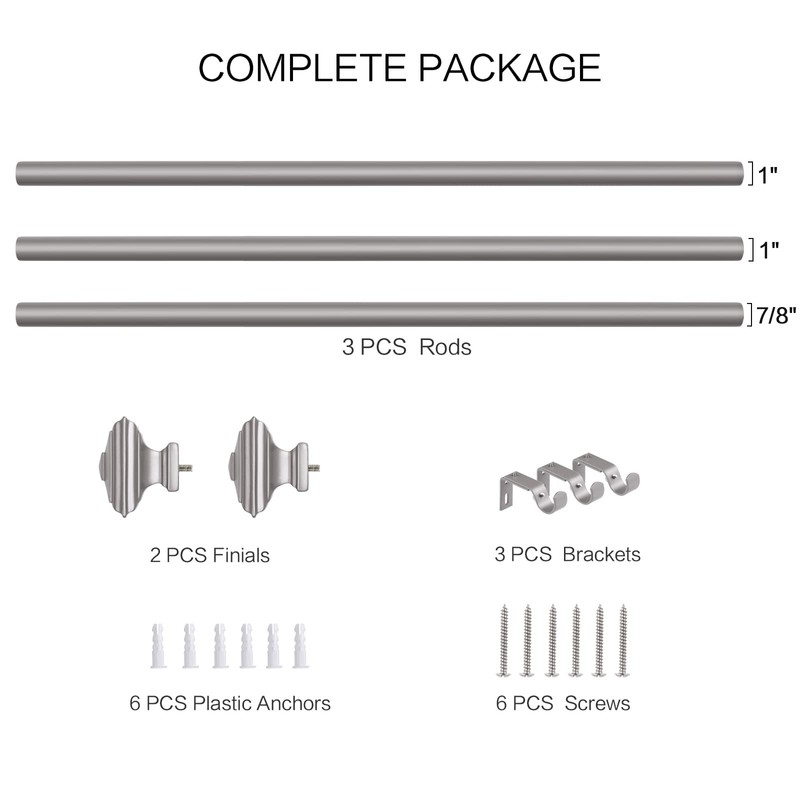 - Easy Mounting: This antique silver curtain rod includes 3 rods, 2 finials, 3 brackets, 6 screws, 6 anchors and 1 installation guide. With necessary hardware and detailed instructions, simple to mount it on the wall. To ensure better stability of curtain rod, please tighten all screws before using the product.