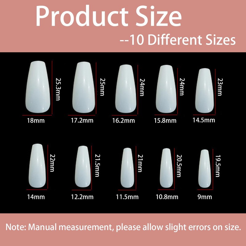 • Easy to Apply & Remove : To apply, first trim, file and clean your nail surface, apply glue to back of the false nails, align with cuticle and press on & hold for 20 seconds, and finally trim the false nails to the perfect length. To remove, first pry the nail edges a seam with a manicure stick, soak enough false nail remover into the seam, wait for a few minutes until soft, and finally take down the false nails