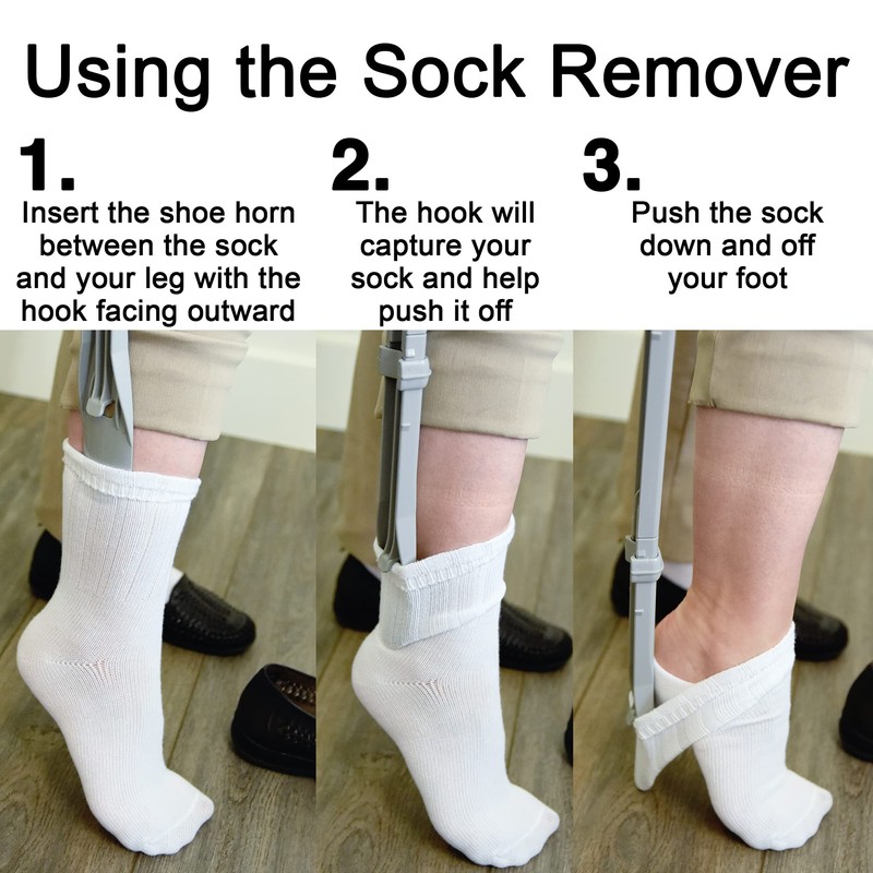 - SOCK REMOVER: The sock remover makes it easier to remove nearly any type of sock, nylon stocking, or hosiery, including compression socks. The sock remover can be used seated or standing.