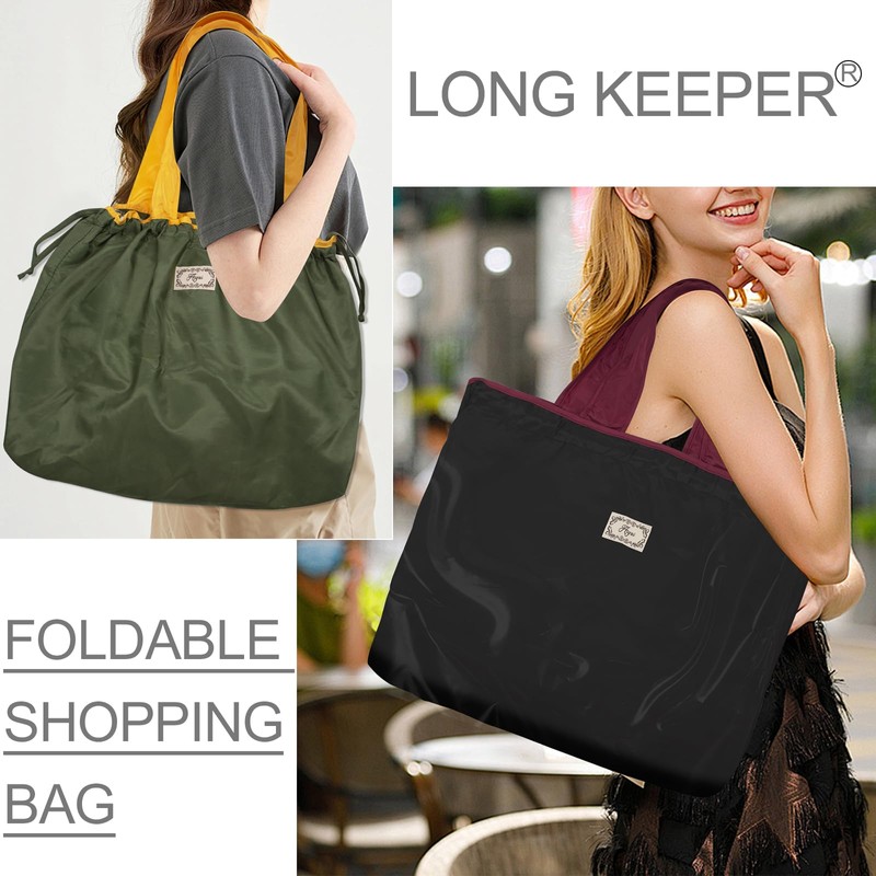 Long Keeper 2 Pcs Foldable Shopping Bag Drawstring Reusable Grocery Bags Large Washable Portable Folding Tote Bag in Pouch for Daily Shopping Travel Household (2, Purple+Army Green)