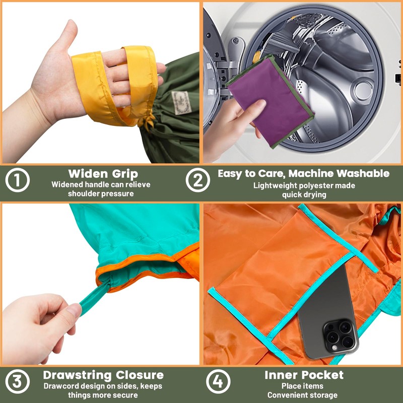 - Multipurpose: Our carry out folding bags are versatile, which could easy transport your groceries and daily shopping, they are sturdy enough to carry fruit, clothes, etc. These shopping bag is designed with special soft hidden handle, when you put the food in, pull the handle out and tie, you will get a drawstring bag. Use them for bringing lunch to office, picnics, travel and camping is very convenient.