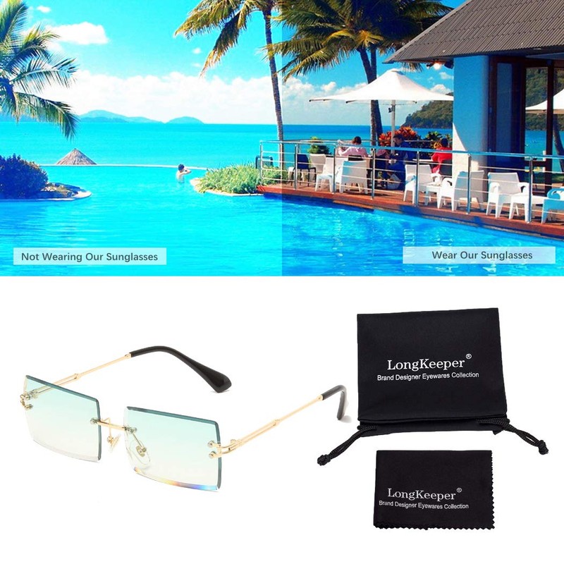 Long Keeper Rimless Rectangle Sunglasses UV400 Protection Antiglare Fashion Frameless Square Glasses for Women and Men (Gold Gradual Green)