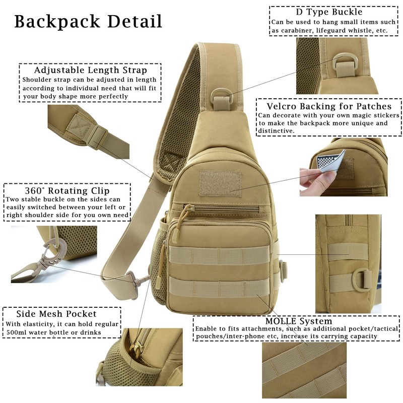 - Humanized Design – ①. The shoulder strap is allowed to switch to left or right side which will reduce your heavy pressure due to a long walk; and the strap is adjustable, the maximum length is 24.8 inches, freely adjust to suit your height and body type; ②. MOLLE external expansion system designed to be used in combination with other equipment which can load pockets, water bottle bag and other, help to expand more room;