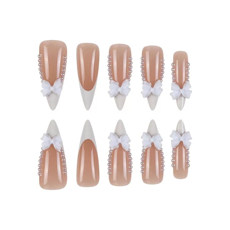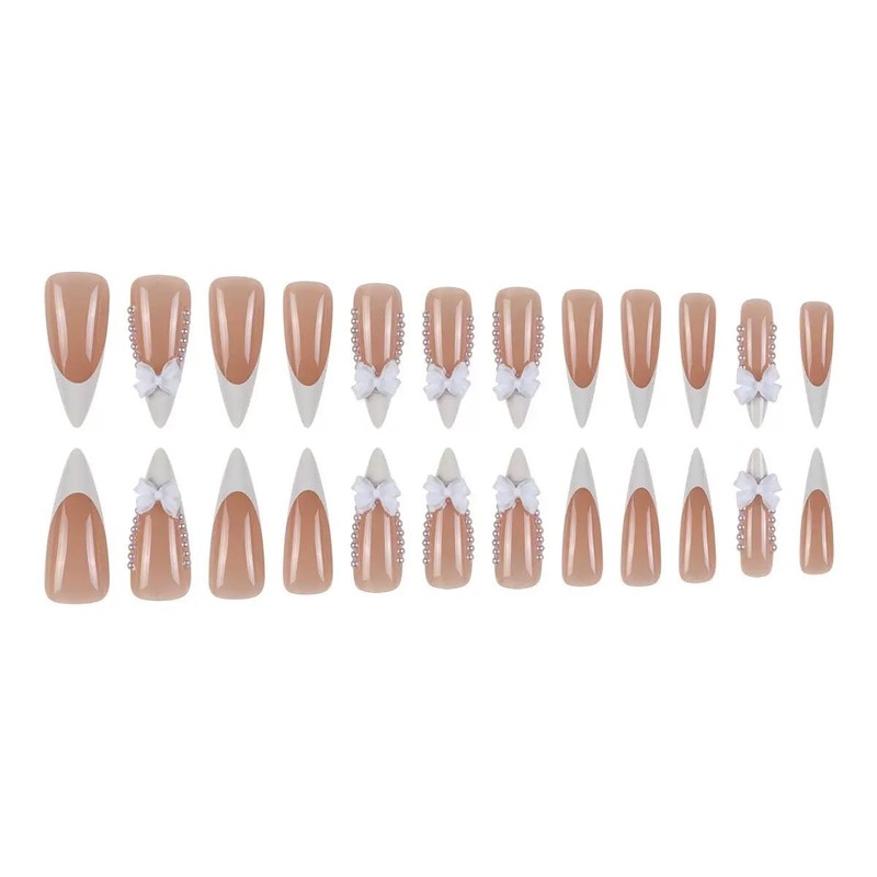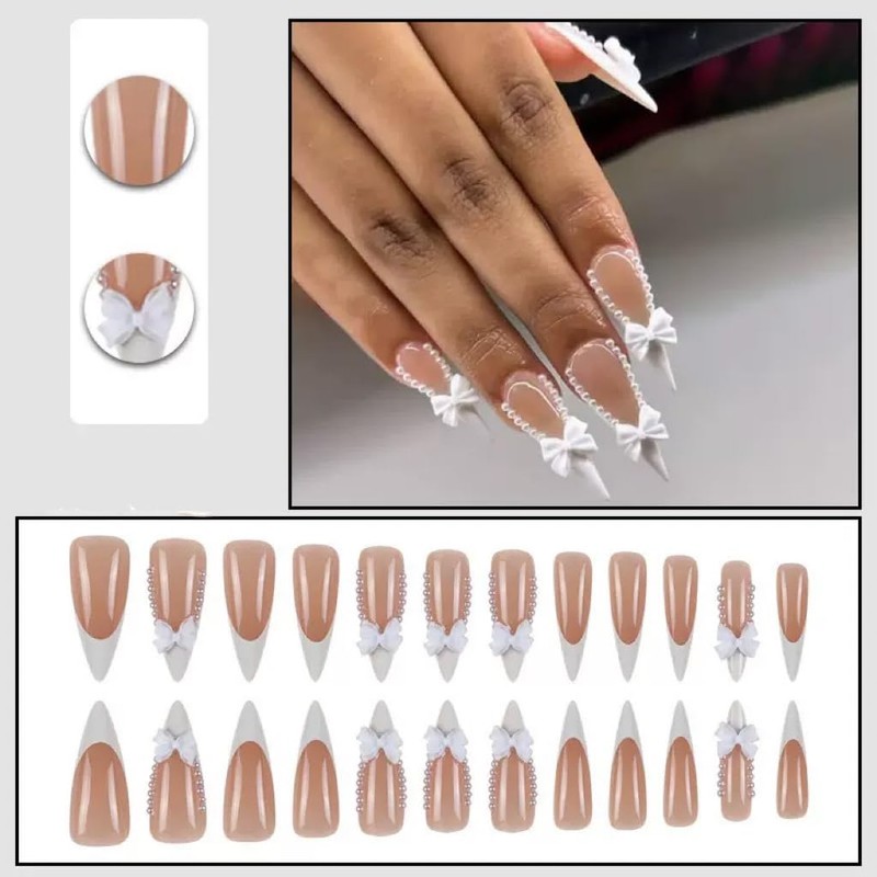 Long Press on Nails Stiletto Fake Nails White French Tip False Nails with 3D Bow Charms Design Glue on Nails Pearl Glossy Acrylic Nails Full Cover Stick on Nails for Women 24Pcs