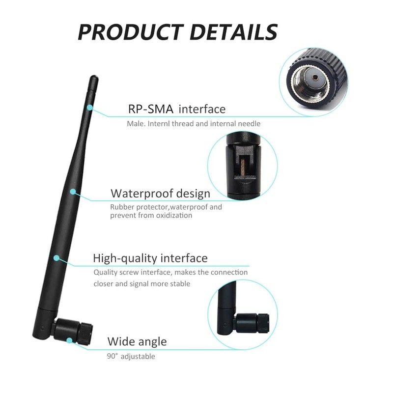 - Gain: 5dBi; Antenna Connector: RP-SMA Male;Antenna Length: 19.5cm/7.7inch;