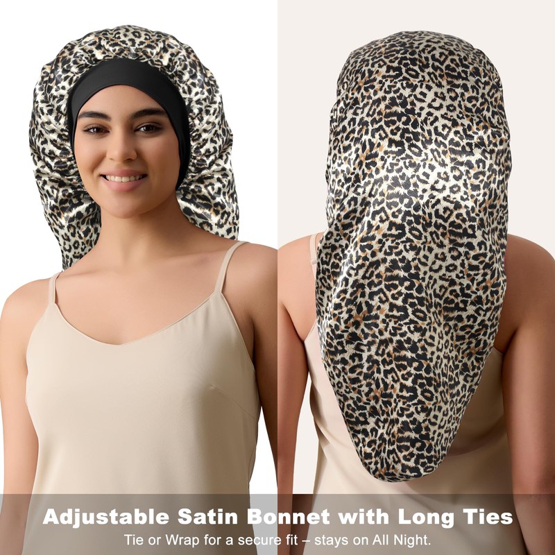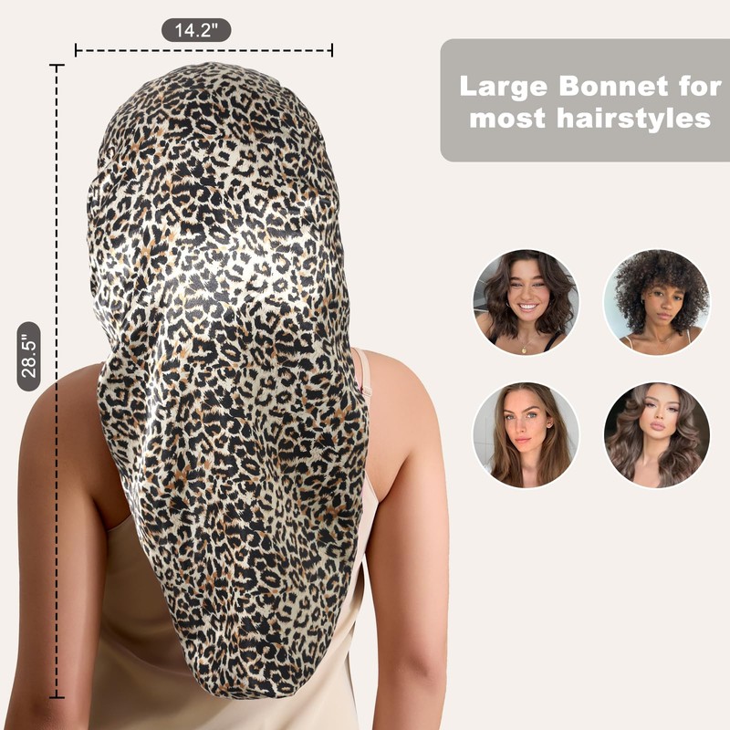 Long Silk Bonnet for Sleeping, Satin Bonnet for Curly Long Hair, Braid, Locs, Dreads, Extra Large Sleep Cap for Women (Leopard)