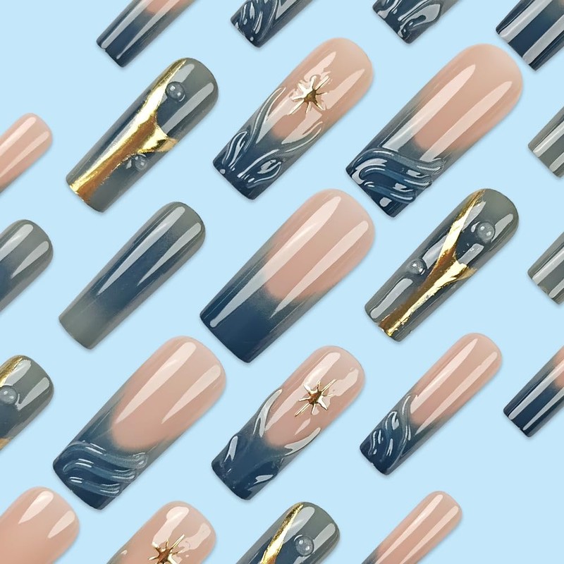 Long Square Press-On Nails Set, Nude Pink to Navy Ombre with Gold Accents and Star Design, 3D Style French Fake Nails, Glossy Glue on Nails for Women, 24 Pieces