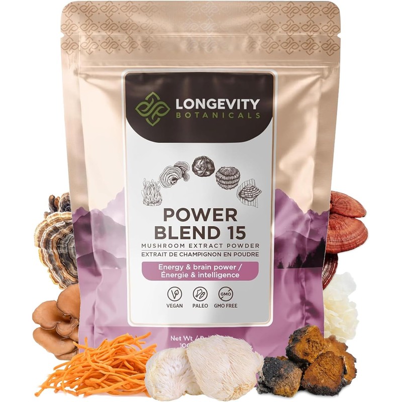 Longevity Botanicals 15 Mushroom Supplement Blend - Mushroom Complex Powder - Promotes a Balanced Immune System, Mental Clarity, Focus, and Relaxation - 100 grams - Longevity Botanicals