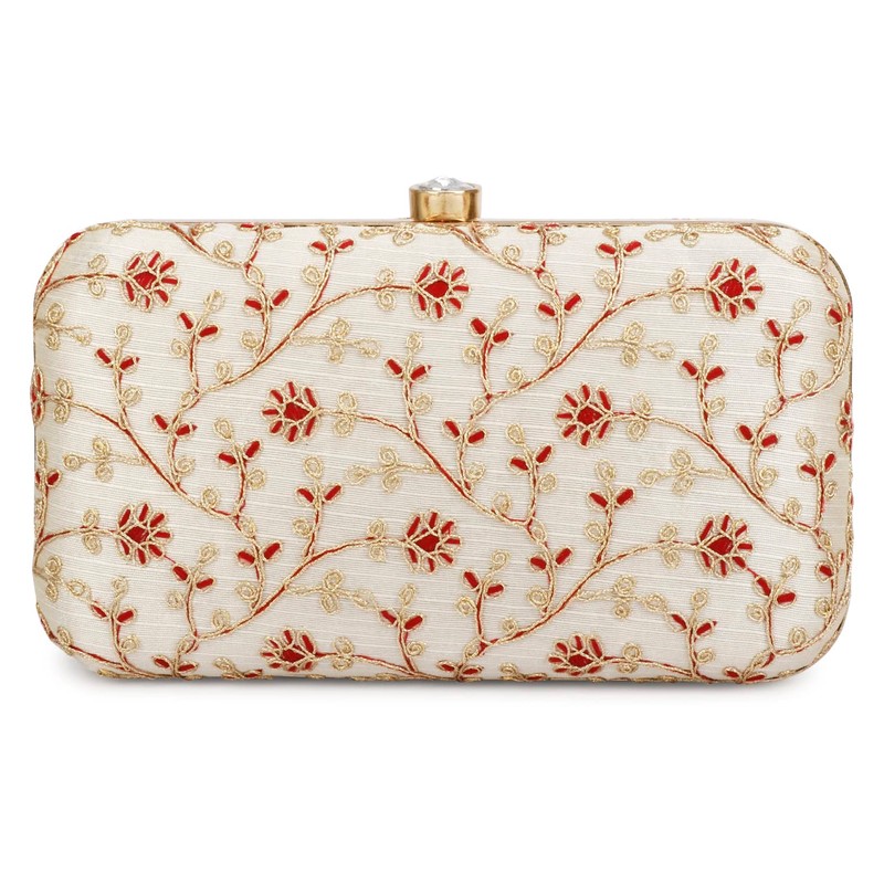 LONGING TO BUY Hand Crafted Designer Box Clutch For Women, Zari Embroidery Clutch For Women/Hand Clutch For Women, Red & Golden-1, Wedding Clutch