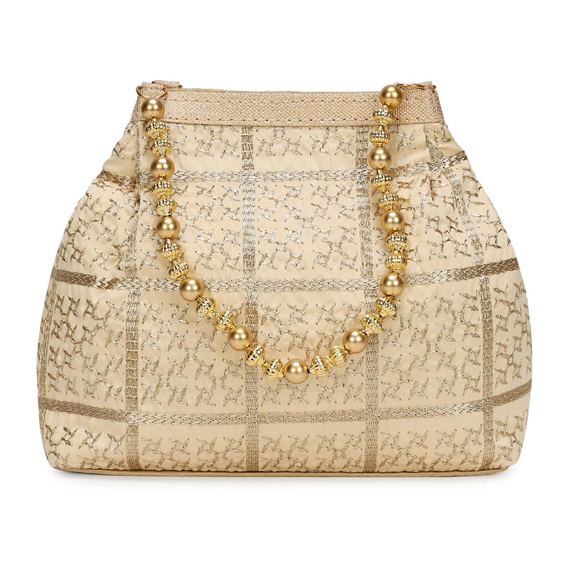 LONGING TO BUY Potli Bags for Women Embroidered Evening Purses with Gold Pearl Handle, Indian Women Potli Bags for Wedding, Golden-001