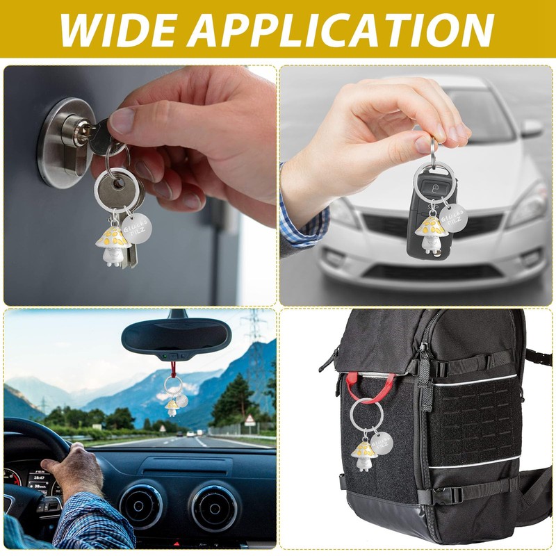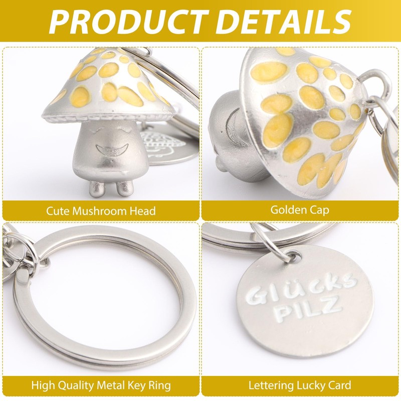 - PACKAGE INCLUDES You will get 1 cute lucky mushroom keychain (with gold dots on the mushroom umbrella, with engraved pendant) and 1 small black gift box. The lucky mushroom keyring with pendant has a smiling face that symbolises joy and happiness, so you will immediately feel happy when you see this keychain!