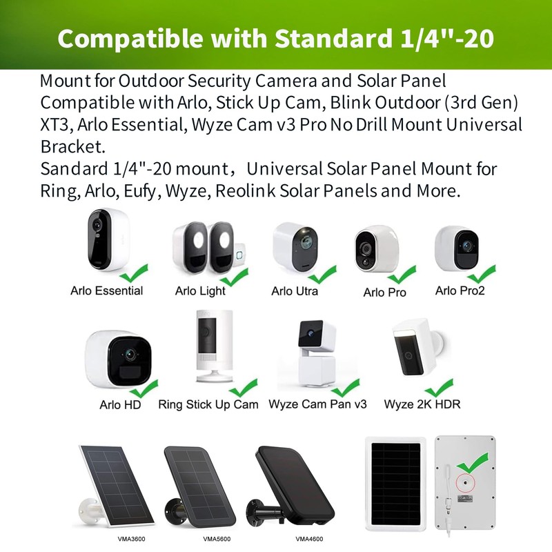- Wide compatibility: compatible with Ring Indoor Cam, Stick Up Cam, Arlo, Eufy, Reolink, Motorola, VTech, Owlet and other cameras with 1/4 inch threaded hole