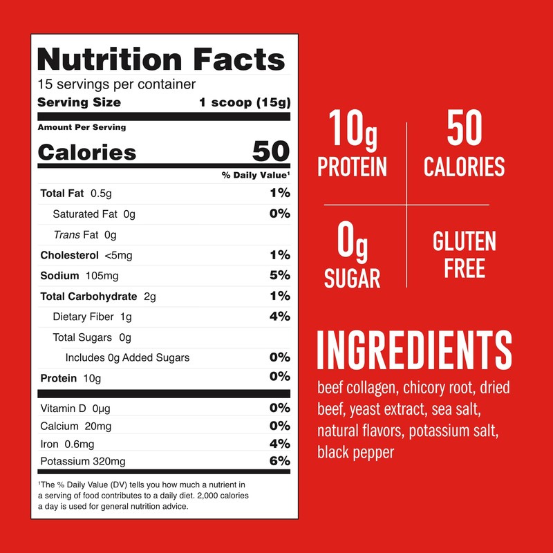- Packs 10 grams of collagen-rich protein and 3 grams of fiber per serving — made from grass-fed, pasture-raised cattle, fresh veggies, and savory herbs, spices, and seasonings