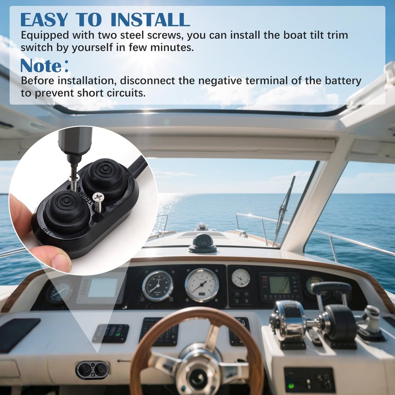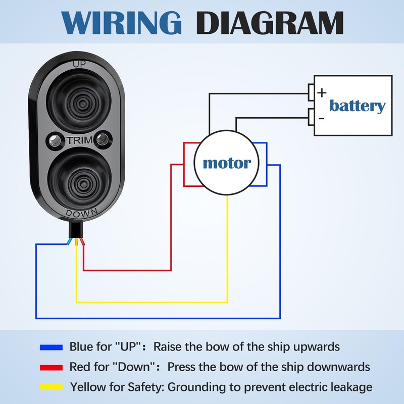 - đ©ăEasy to InstallăThe boat trim switch is easy to install and operate. The package includes a boat trim switch and two screws. Please check the wiring diagram before installation. Locate trim wires (YELLOW for ""HOT"", BLUE for ""UP"", and RED for ""DOWN""). You can install the boat tilt trim switch by yourself in few minutes.