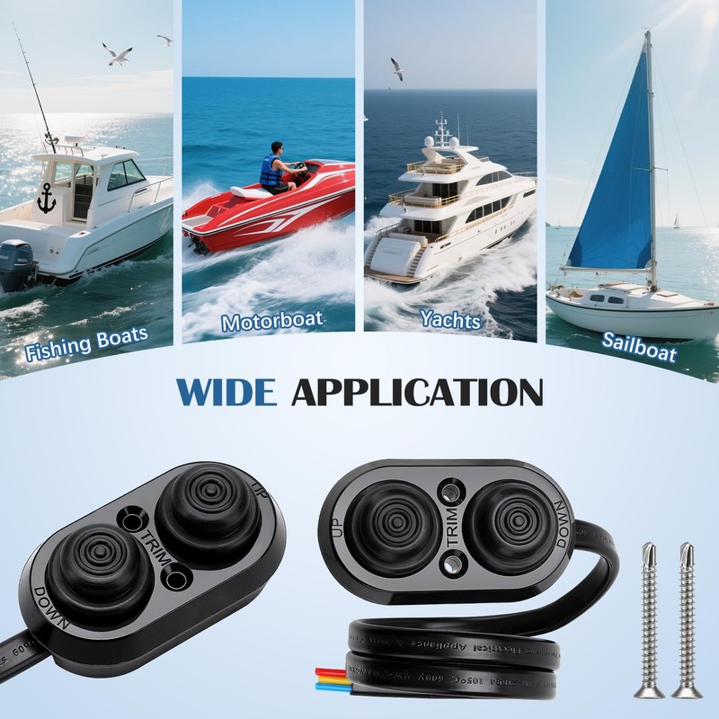 - đ©ăWide ApplicationăThe boat tilt trim switch can be used to trim the bow "up" or "down" to by buttom to balance the out of engine or stern drive, which is applicable for Fishing Boat, Motorboat, Yachts, Sailboat and etc.