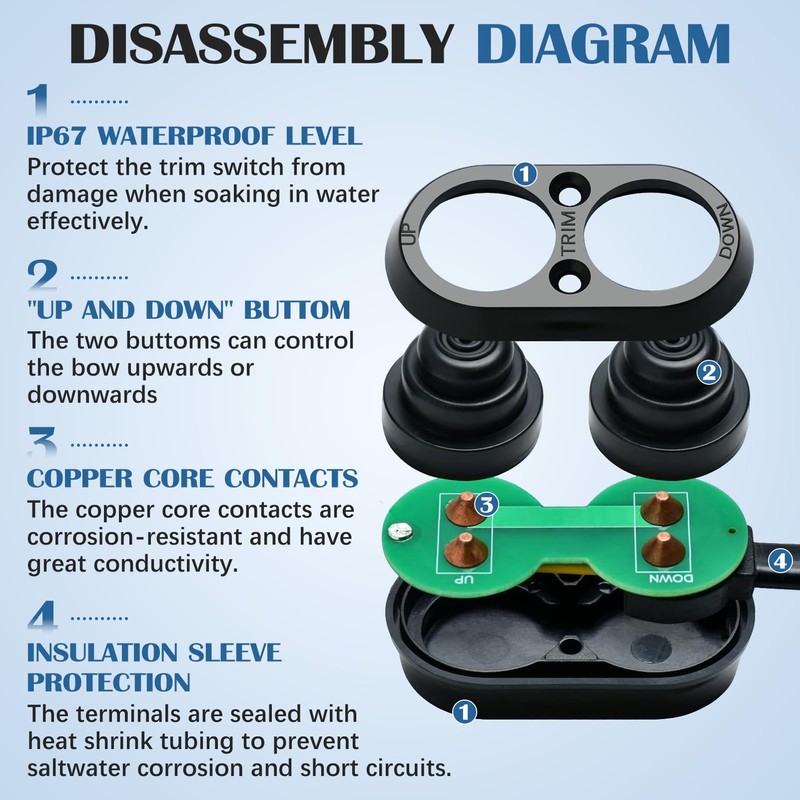 - đ©ăSafety ProtectionăThe power cord of tilt trim switch meet UL listed and the cords adopt copper material , which makes them corrosion-resistant and have great conductivity.