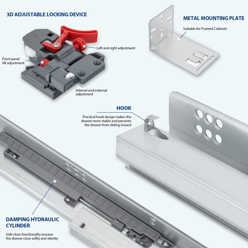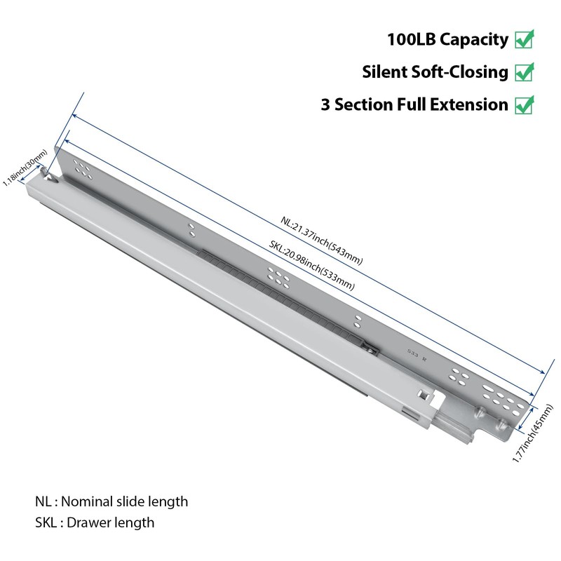 - PACKAGE CONTENT:1 pair(2 packs) of 21inch undermount drawer slides,rear mounting brackets, 3D adjustable locking device, mounting screws and instructions.The detailed size can be seen in the picture introduction on the details page.Please choose the right size before you purchase our soft close undermount drawer slides.