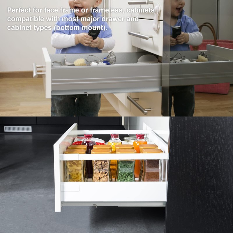 - SAFE & BEAUTIFUL:The concealed design of the slide rail makes the furniture look more beautiful and high-end, and the slide rail is placed at the bottom of the drawer to improve the safety of use.It can be installed in either panel (frameless) or face frame (Framed) cabinets
