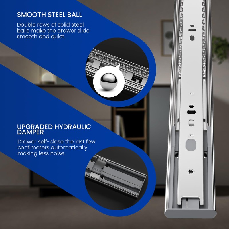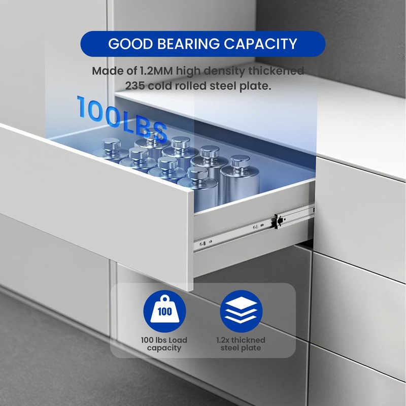 • 3-Section 100% Full Extension:Fully extend drawers to access rear items instantly. Ball bearing system ensures smooth operation even when overloaded