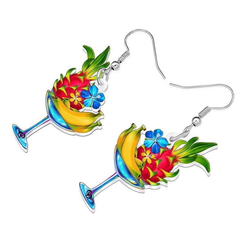 - Original design: Vibrant cocktail glass-shaped earrings featuring colorful dragon fruit, bananas, and tropical flowers in a playful margarita glass setting,suitable for beach parties, summer celebrations, tropical-themed events, or adding a fun accent to casual outfits.