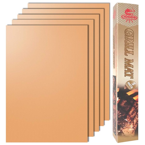LOOCH Copper Grill Mat Set of 5 - Non-Stick BBQ Outdoor Grill & Baking Mats - Reusable and Easy to Clean - Works on Gas, Charcoal, Electric Grill and More - 15.75 x 13 Inch