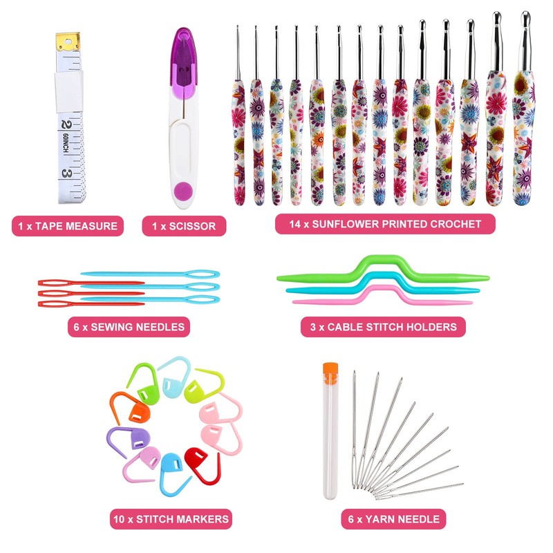 - 🧶 Great Value - ★★If you get this , you will never regret it!!! You get 14 ergonomic crochet hooks, 10 stitch markers, 9 stainless steel needles, 6 big-eye needles, 3 bow-shaped needles, 1 tape measure, 1 pair of scissors, and 1 case. This is fantastic value for your buck! The great crochet kit can meet all your different demands in crocheting
