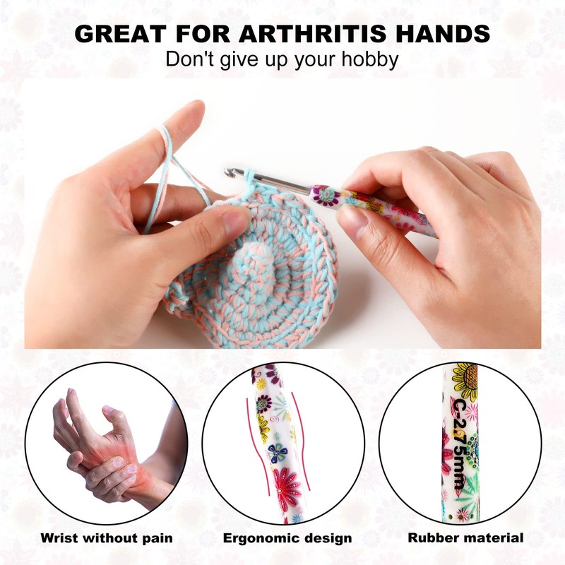 - 🧶 Crochet Hooks Set with Comfortable Handles: Crochet hooks with ergonomic, soft-grip handles can reduce or eliminate hand, wrist, or finger pain. They are perfect for arthritic hands. The comfortable rubber handle provides a nice, firm grip so you can crochet longer without discomfort