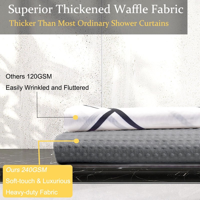 2. 230GSM Heavy Duty Waffle Fabric, Hotel Quality: The shower curtain is designed with exquisite waffle weave pattern, showing a luxurious and fashionable style, allowing you to enjoy a hotel-like comfortable feeling while bathing, adding an elegant atmosphere to your bathroom.