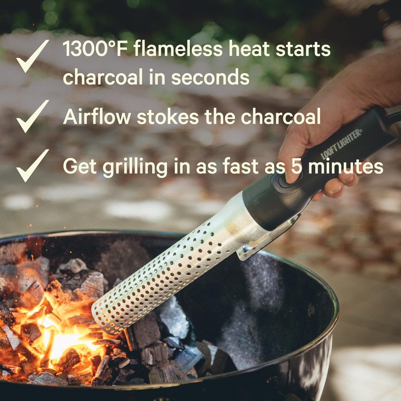 - QUICK - 1200°F flameless heat starts your charcoal in seconds so you can get grilling in as fast as 5 min. The superheated airflow in the Looft Air Lighter speeds up the process and turn the charcoal grey and grill ready in no time.