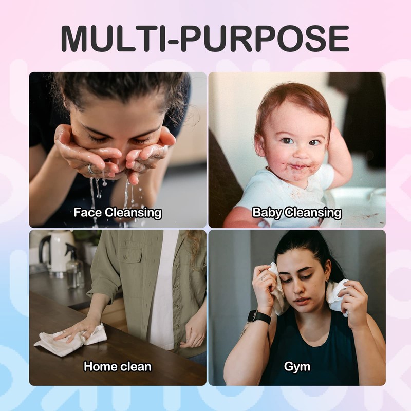 - 😍 Multi-purpose Use: Can be used as dry towel to clean hands, face for baby, kid and adult. When using with cleanser, it becomes makeup towel to wipe away makeup. Also great to wipe any surface e.g. cabinets, sink, kitchen, etc