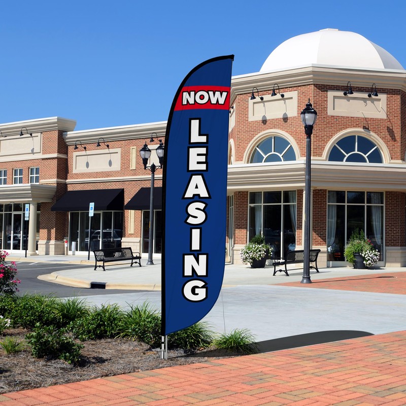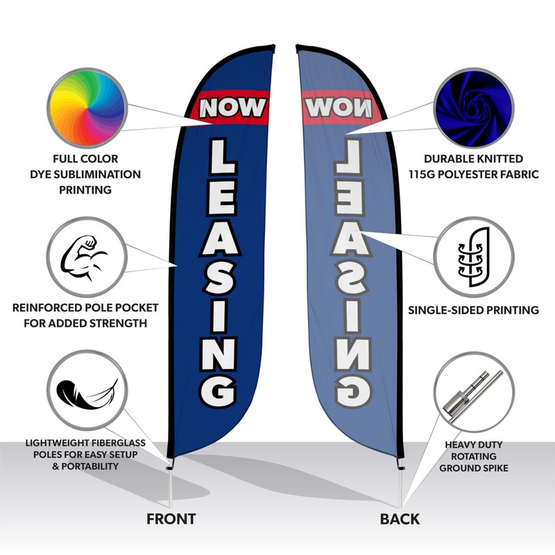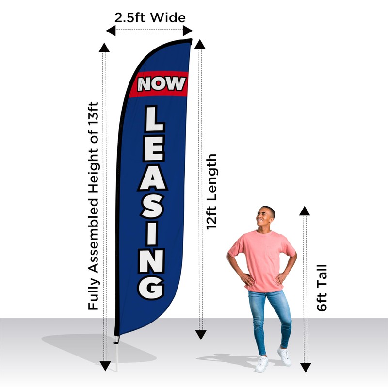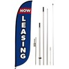 LookOurWay Feather Flag Pole Kit - 12 Feet Tall Advertising Flag Banner with Fiberglass Pole Kit and Ground Spike for Business Promotion - Real Estate Flags - Now Leasing Blue