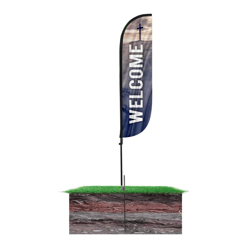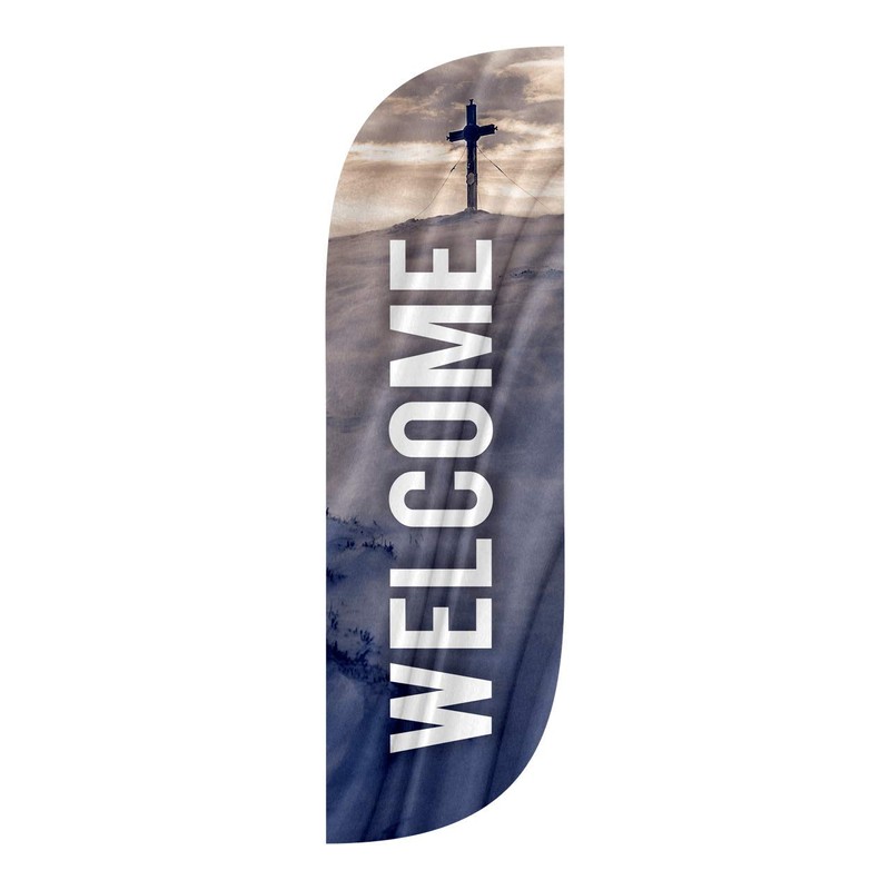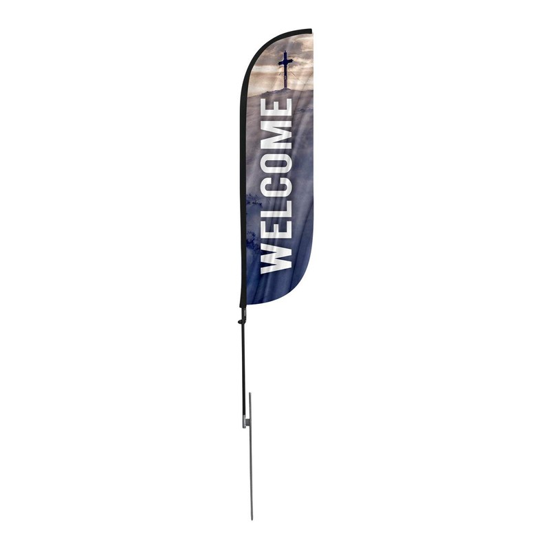 Welcome congregants and church goers to your services or masses with the "WELCOME" Christian themed 5ft feather flag. When assembled onto a LookOurWay small pole set (required for use), this banner will stand at 7ft tall. This design has a beautifully crafted image of a cross aatop a snowy mountain peak against a morning sky. The word "WELCOME" is printed down the main body of the flag in white with bold shading to make it stand out and be clearly visible. This set comes with the flag, pole sets, and ground spike; everything needed for operation.