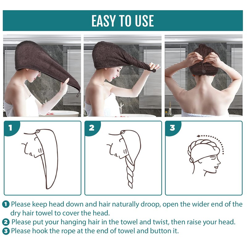 - DURABLE & CONVINENT: Cap design with buttons straps are firmly stitched, simple to put on than the ordinary square towel The unique twist and loop system makes the hair towel wrap that stays in place. Use it day after day and wash it hundreds of times without wearing out or losing any function, no shrink or color fading