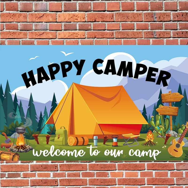 - LOONELO Happy Camper Backdrop with 70.9"X43.3", Large Size Polyester Fabric Camping Backdrop Banner Sign, Camping Supplies Background Photography for Camping Themed Party Decoration Supplies