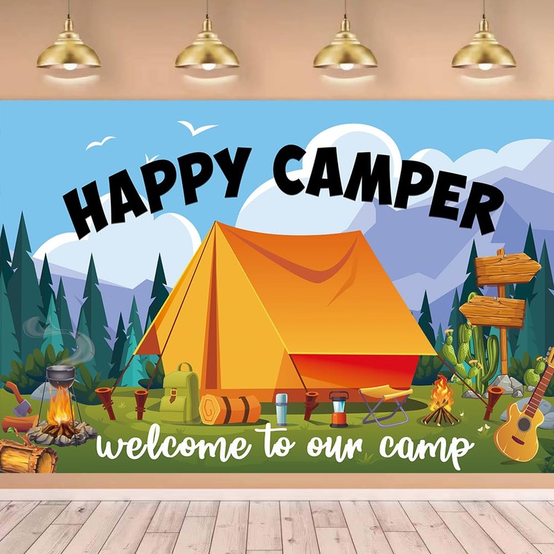• LOONELO Happy Camper Backdrop with 70.9"X43.3", Large Size Polyester Fabric Camping Backdrop Banner Sign, Camping Supplies Background Photography for Camping Themed Party Decoration Supplies