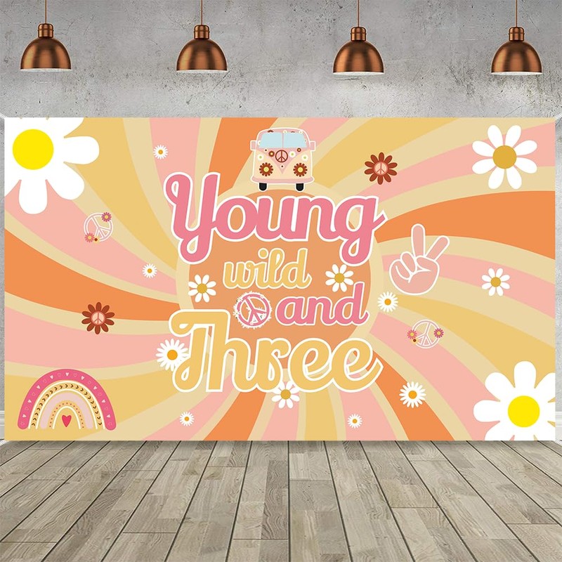 LOONELO Young Wild and Three Birthday Party Backdrop Banner with 70.8X43.3in, Three Groovy Retro Hippie Boho Daisy Flower Photography Background Decorations for 3rd Birthday Party Supplies